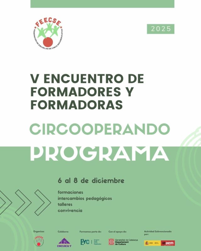 Queridas escuelas, tenemos el placer de anunciaros las fechas del V° Encuentro de Formadoras/es de la FEECSE 🎪🙌🏼 ➡️ Apunta! 🌍 Llinars del Vallès (Barcelona ) 📆 del 6 al 8 Diciembre 2025. 🔴 «Circooperando» es el lema que hemos elegido para esta edición para seguir investigando y compartiendo metodologías y herramientas […]